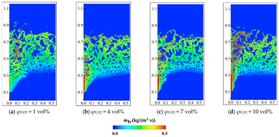 The phase distribution and local CO2 release rate distribution are shown in Figure 8 and Figure 9. Under the condition of a higher inlet entrained CO2 volume fraction, the phase-change process in the intense flash area is slightly changed because the increase in the inlet flow rate of entrained CO2 increased local CO2 concentration; however, the increase in the inlet flow rate also intensified the bubble uplift process, thus narrowing the area of the intense flashing area around the inlet. In general, the more inlet-entrained CO2 shrank the region of the intense flash area, but increasing the intensity of the phase transition, and had little effect on the gas–liquid distribution.