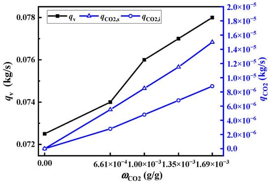 The PISO method was used to couple the momentum and mass equations. The gradient was obtained using the least-squares method, and the density, momentum, turbulent kinetic energy, turbulent dissipation rate, and energy equations were in a first-order windward discrete format. The time step used for transient calculations was 5 × 10−5 s. The under-relaxation factors were used at values 0.3 (pressure), 0.3 (momentum), 0.5 (turbulent kinetic energy and turbulent dissipation rate), 1 (mass fraction), and 0.8 (energy) [36,37]. The convergence criterion was set to a residual of less than 10−6 (energy equation) and 10−3 (continuity, momentum, turbulence, and CO2 transport equations).