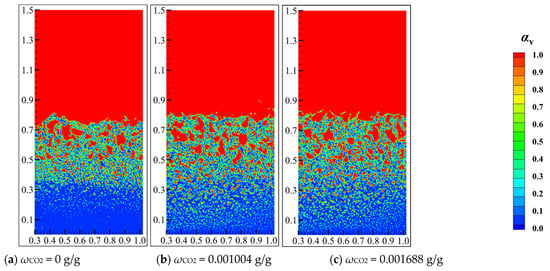 The phase distributions for the different dissolved CO2 mass fractions are shown in Figure 12. The phase distributions for different cases were slightly different owing to the release of CO2. Compared with the pure-water flashing condition, the intense flashing area in the flashing chamber increased, but the change was small. Compared with the flash evaporation process of pure water without CO2, the release of dissolved CO2 causes a low local partial pressure of water vapor in the bottom water body, resulting in denser bubbles of the mixed components of water vapor and CO2 during slow flash evaporation. This causes the steam generation rate to increase slightly and leads to the junction between the severe flash region and slow flash region being not very obvious, especially for a high dissolved CO2 concentration. The liquid height showed little increase, and a larger liquid–gas interface was produced, which also led to an increase in steam generation.