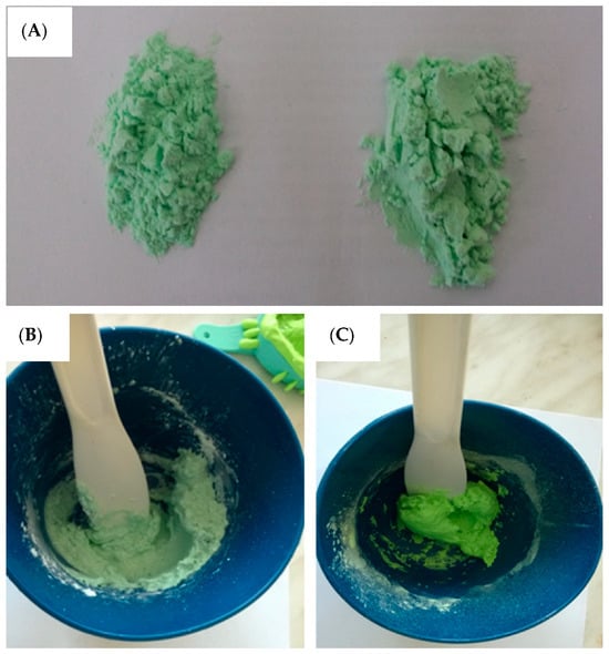 The composition of the alginate material prepared for testing is presented in Table 2. Raw composition of alginate impression material is widely known in the literature [,]. All raw materials were used without further purification. The components were added by weighing all ingredients on a laboratory scale and mixing for 10 min in a high-speed mixer at 500 rpm (Netzsch, Selb, Bayern, Germany). Finally, 0.25 wt%, 0.5 wt%, and 1.0 wt% of AlphaSan 2000 were added to the base powder prepared in this way, and mixed again for 5 min. The compositions with 0.25 wt%, 0.5 wt%, and 1.0 wt% of AlphaSan were designated as X1, X2, and X3, accordingly. For testing the commercial materials, they were mixed with water according to the recommended ratio shown in Table 1. X1–X3 formulations were mixed by spatula with ratio of 6 g powder to 16 mL water. Figure 1 shows the mixing of the new alginate.