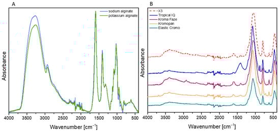 At first, the composition of the studied impression materials was studied with FT-IR and TGA. FT-IR allowed for qualitative identification of the materials’ components, while the TGA allowed for quantitative analysis of the organic (alginate) fraction within the formulations (Figure 4). As the alginate salts are a common ingredient present in all the formulations, both commercial and those prepared within this study, sodium alginate and potassium alginate were used as spectral standards for the sake of comparison and to identify the absorption bands associated with the functional groups of the alginate component (Figure 4A). From the compositions prepared within this study, only X3 was shown, as their spectra were virtually identical; it was compared with the commercial samples (Figure 4B). The FT-IR spectra for pure potassium and sodium alginates exhibited characteristic signals in the range of 3400–3200 cm−1, which originated from the stretching vibrations of hydroxyl groups (OH) and carboxyl groups (-COOH) present in alginate molecules. The bands at 2933 cm−1 can be attributed to stretching vibrations of C-H groups occurring in polysaccharides. In the range of 1428–1400 cm−1, there are bands originating from C-OH deformation vibrations and symmetric O-C-O stretching vibrations. The signals located at 1025 cm−1 correspond to the stretching vibrations of the C-O carboxyl group. The presence of vibrations of the carbonyl group (-C=O) confirms the signal at 1593 cm−1. The signals at 1123 cm−1 and 947 cm−1 are assigned to the C-O stretching vibrations occurring in the pyranosyl ring. Commercial alginate samples contain other substances, such as calcium sulphates, celite, phosphates, oxides, and colouring and flavouring substances. FT-IR-ATR spectra show characteristic signals coming from silica, which is the main component of celite. The intense band at 1068 cm−1 corresponds to asymmetric Si-O-Si vibrations, while 790 cm−1 corresponds to symmetric stretching. Signals at 1620–1615 cm−1 confirm the presence of vibrations of the carbonyl group (-C=O), while those at 1415–1405 cm−1 correspond to C-OH deformation vibrations and symmetric O-C-O stretching vibrations. The range of 3400–3200 cm−1 is assigned to the stretching vibrations of hydroxyl groups (OH). The Tropical IQ sample exhibits additional signals at wavelengths of 1416 cm−1 and 874 cm−1, which originate from the vibrations of inorganic carbonates []. The presence of these carbonates has been confirmed by TGA analysis, as described in Section 3.2.