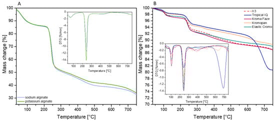TGA and DTG curves. (A) Pure potassium and sodium alginates; (B) commercial alginates and material with bacteriostatic agent (X3).
