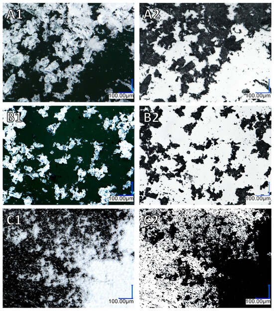 Microscopy images of the materials used for the study, 300× magnification. (A1,A2) Sodium alginate; (B1,B2) potassium alginate; (C1,C2) AlphaSan RC 2000. Left row captured in a light mode, right row in a dark mode.