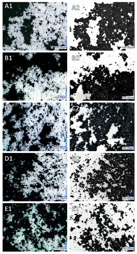 Microscopy images of the commercial and obtained formulations, 300× magnification. (A1,A2) KromaFaze; (B1,B2) Tropical IQ; (C1,C2) Kromopan; (D1,D2) Elastic Cromo; (E1,E2) X3. Left row captured in a light mode, right row in a dark mode.
