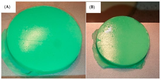 Because alginates are very sensitive to evaporated water, compatibility tests with plaster were performed immediately after assessing the material surface, i.e., within 10 min of mixing the powder with the liquid. After surface analysis, the alginate impression was washed under a stream of water at a temperature of 23 °C for 30 s in order to remove unreacted alginate residues from its surface, which could disturb the smoothness of the surface of the plaster cast. Then, the disc was placed in a metal ring as described in ISO 21563:2021 [] and poured with gypsum class 3 (Mramorit Blue, SpofaDental, Jicin, Czech Republic). The plaster was mixed manually in the proportion of 30 g of water/100 g of plaster for 30 s according to the manufacturer’s instructions. Then, the silicone bowl with the mixed plaster was placed on a vibrating table (Falab, Warsaw Poland) for 30 s, stirring constantly to remove the gas bubbles contained in the material. Next, the alginate impression in the metal ring was placed on the same vibrating table, and the plaster was poured very slowly with small amount only from one side of the mould (left or right). The whole thing was subjected to vibration for 30 s.