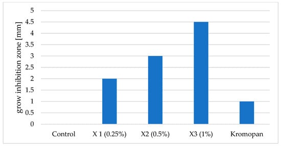 Figure 10 shows the degree of antibacterial activity that changes with increasing AlphaSan loading in the alginate material, compared to Kromopan. When the additive content was 1%, the antibacterial inhibition zone for S. mutans was the largest and reached 4.5 mm. For the control sample (agar only), there was no inhibition zone present. For alginate Krompan, this value was 1 mm. This effect may be related to the ingredients contained in alginates, phosphates, and potassium fluorotitanate, which decomposes in contact with water, releasing small amounts of hydrofluoric acid. For the composition studied, a higher AlphaSan loading causes an increase in the concentration of silver ions, resulting in a higher ion gradient between the alginate gel and agar, silver ion migration, and an increase in the inhibition zone, where the growth of microorganisms is observed.