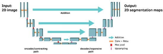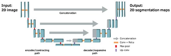 The key strength of the UNet architecture lies in its ability to extract features at multiple levels of resolution and reconstruct the output segmentation map with the required dimensions, thanks to its symmetrical encoder–decoder structure. The architecture of UNet comprises two main routes: the contraction path (also known as the encoder or analytic path) and the expansion path (also known as the decoder or synthesis path) [].