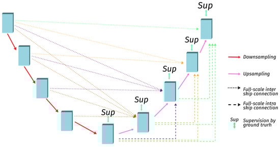 Complementing the innovation of full-scale skip connections, UNet 3+ leverages a full-scale deep supervision strategy. This strategy underpins a hybrid loss function designed to capture information at pixel, patch, and map-levels. The fusion of this loss function with the full-scale skip connections results in the model’s capacity to learn hierarchical representations from the aggregated feature maps across the full scale. This synergy heightens the discernment of region of interest boundaries and positions, contributing to the model’s enhanced segmentation accuracy. Figure 4, which has been adapted from [], shows UNet 3+’s general architecture.