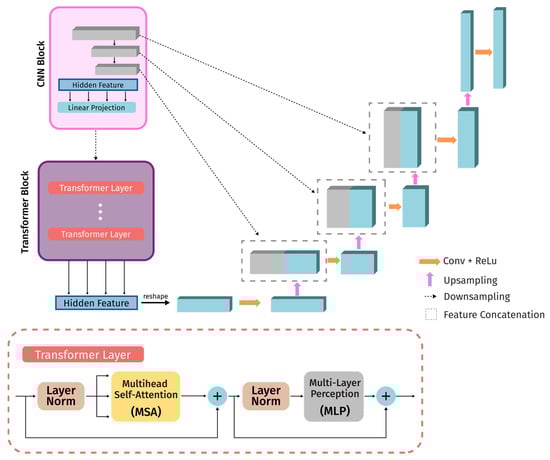 TransUNet also introduces an innovative enhancement through the inclusion of additive Transformers within the skip-connections. This strategic integration further augments the model’s capability to capture salient features and intricate structures, ultimately enhancing the quality of the segmentation results. Figure 5, adapted from [], illustrates the general structure of TransUNet.