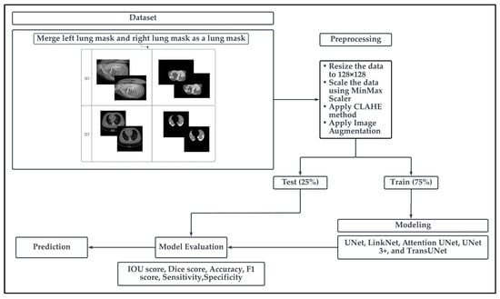 UNet [] is a widely recognized and extensively used deep learning architecture based on Convolutional Neural Networks (CNNs) for medical image segmentation. Specifically, in the context of lung segmentation, the UNet architecture, which combines CNN encoder and decoder techniques, has been employed to achieve rapid and precise segmentation of lung structures [,,].
