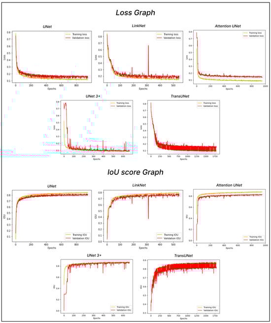 Comparison of the loss and the IoU score graphs of the UNet, Linknet, Attention UNet, UNet 3+, and TransUNet algorithms during the training process.