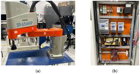 The SCARA manipulator used as an experimental study was adapted to operate more openly, as its controller and servomotor drives were damaged; that is, it was no longer working. Therefore, a programmable logic controller (PLC) was used to control the manipulator, and frequency inverter drivers were used to drive the servomotors. Figure 1b presents an idea of the experimental setup of the SCARA manipulator.