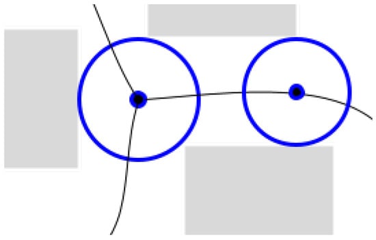 Using a controlled thinning, where relaxed influence zone criteria allow non-maximum circles to be present, the TPP algorithm shrinks the free space F until the resulting area is a roadmap surrounding the obstacles, including larger regions, as shown in Figure 3c. In this paper, the thinning procedure is modulated by distance and a number of obstacles nearby. As a result, our proposal preserves more points between obstacles, as shown in Figure 4. This behavior allows the next step to find shorter paths between and .