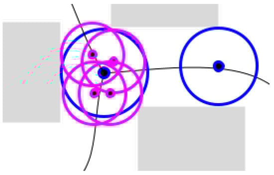 Disk size is modulated by zones of influence driven by distance and obstacle population. Both maximum (blue) and smaller (magenta) disks are allowed in specific regions.