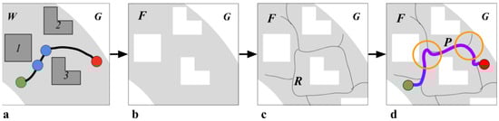 Topological path planning model. (a) The environment shows the obstacles (1, 2, and 3), start (green), goal (red), and the optimum path. Blue marks represent critical positions. (b) The free space F. (c) The subsets of homotopic roadmaps are achieved by controlled thinning. (d) The topological path P is depicted in purple.