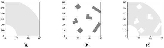 One of the inputs for TPP is a map M of the obstacles inside the robot workspace. This map can be generated using object detection from digital images acquired by a static camera or an image generated by light detection and ranging (LIDAR) sensors. Figure 6 shows an example of an SCARA workspace (Figure 6a), a map M (Figure 6b), and a free space F (Figure 6c).