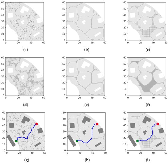 Examples of PRM, TPP* and TPP, respectively: (a–c) the nodes, (d–f) the roadmps and (g–i) the final shortest path.