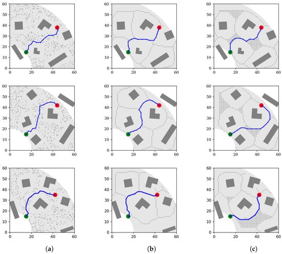 Results of (a) PRM, (b) TPP*, and (c) TPP for three different scenarios, same scenario per row.