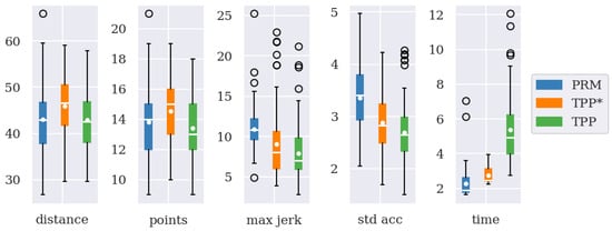 We highlight that the TPP presented better results in relation to the PRM and TPP* in the distance criteria, which were the smallest, 42.86 cm, in relation to the PRM and TPP*’s 43.03 cm and 45.90 cm, respectively. Regarding the number of points on the path, the TPP also presented lower results, , while they were for the PRM and for the TPP*. The maximum jerk for TPP was the lowest among the others, which was 7.91 degree/s3; for PRM, it was 10.91 degree/s3, and for TPP*, it was 9.05 degree/s3. Regarding the standard deviation of acceleration, the TPP also presented a lower result, , while that of the PRM was and that of the TPP* was . In the computation time criterion, PRM presented the best result, 2.26 s, TPP* spent 2.75 s, and TPP spent 5.37 s, which was the longest time. From the five criteria compared, TPP presented the best result in four criteria, being below the others only in relation to computing time. With this, it can also be concluded that TPP can be used as a collision-free trajectory planning method for industrial manipulators.