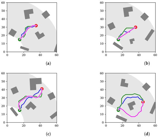 Because the TPP roadmap is built to preserve the topology of the free space, it constrains the resulting path at an intermediate distance between obstacles. The path is short, minimizes undesired detours, and ultimately prevents collisions with the obstacles, as shown in Figure 10. TPP finds solutions for any number of nodes, and every solution is feasible. Obviously, the greater the number of nodes, the greater its execution time. Despite TPP always finding the same solution for the same scenario, an alternative solution can be chosen if the prior must be discarded for any reason. Figure 10d illustrates an alternative solution obtained using TPP. Thus, TPP results highlight two main general advantages of its collision-free path: it is predictable and smooth. Although it provides a better single solution per scenario, it does not always deliver the shortest path and the greater number of nodes of TPP compared to TPP* makes the prior slower.