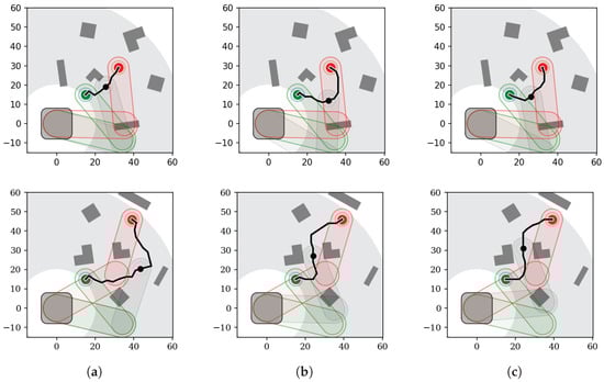 SCARA manipulator trajectories for (a) PRM, (b) TPP*, and (c) TPP. Manipulator positioned at start (green), middle (black), and goal (red) points for two different scenarios (top and bottom rows).
