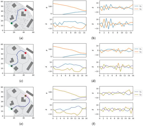 Results comparison for same scenario. (a,b) PRM path and thetas. (c,d) TPP* path and thetas. (e,f) TPP path and thetas.