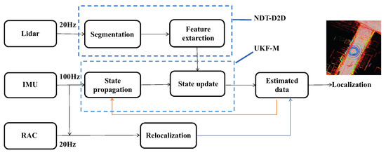 The overall framework of this paper is illustrated in Figure 2. In this framework, the IMU serves as a source for predicting filtered states, while the 3D lidar provides precise observations through point cloud matching. Additionally, an RAC (Realtime Array Calibration) relocalization algorithm is designed to ensure the algorithm’s stability in challenging environments. Compensation mechanisms are established among multiple sensors such as point cloud distortion correction and global relocalization, which are detailed in Section 4.3.3.