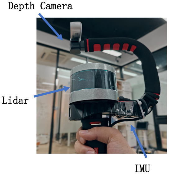 This section describes a series of experiments carried out to qualitatively and quantitatively analyze the localization framework proposed in this paper. The sensor suite that we used consisted of a combined handheld device comprising a depth camera (D435), a 16-line LiDAR sensor (Velodyne VLP-16), and an IMU (3DM-GX5). As depicted in Figure 3, this platform served as the sensor data input source for algorithm validation.