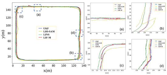 To clarify the comparison between algorithms, we calculated the absolute trajectory error (ATE) algorithm metrics using the Campus dataset (Figure 4). As shown in Table 2, LIF-M has a lower global error, helping to ensure operation in a variety of challenging environments.