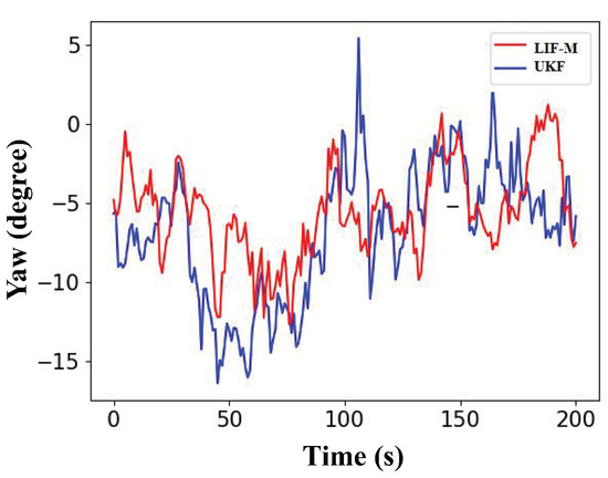 A comparative experiment was conducted between UKF and LIF-M regarding deviations during straight-line motion. Datasets of approximately 10 s were collected along a straight path and the yaw values were compared, as illustrated in Figure 6. LIF-M demonstrates smaller angular fluctuation during straight-line motion, with a maximum deviation of around 6°, less than the 10° oscillation error exhibited by UKF.