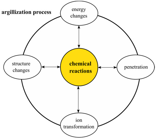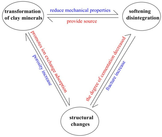 The argillization process is a complicated process concluding disintegration and softening, structural change, the transformation of clay minerals, etc. When considering changes in the external environment and other factors, the process of argillization becomes more complex and difficult to distinguish. But, the above-mentioned changes have some degree of promoting or inhibiting effect on each other (Figure 3). In the process, the required energy should be transformed from the mechanical energy provided by tectonism to the chemical energy of a chemical reaction. Furthermore, the energy is partly displayed in the form of phase transformations, thermodynamic changes, ion transfers, and structural changes. So as to produce all kinds of reactions in Figure 4 and ultimately lead to the complete occurrence of the argillization process.