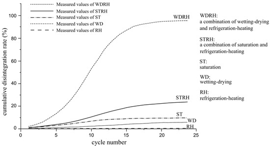 The relationship between the number of cycles and disintegration rate of soil under different conditions (modified from Zhang, D. [22]).