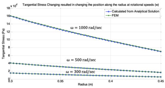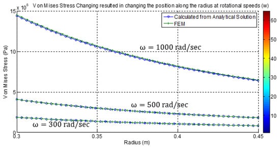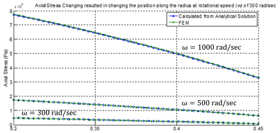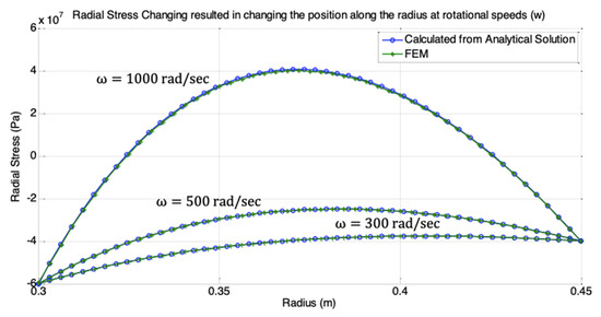 Applying analytical, numerical, and FE ANSYS® solutions, vast results of radial, tangential, Von-Mises stresses, and strain rates for all loadings and rotational speed conditions are obtained. However, as stated above, the depicted speeds used for calculations and result display were 300, 500, and 1000 rad/sec. Typical FE results obtained for radial stress ; tangential stress ; and equivalent Von Mises Stress in the radial direction are shown on part of the cylinder color contour graphs in Figure 4, for . Meanwhile, Figure 5, Figure 6, Figure 7 and Figure 8 show the radial stress, tangential stress, axial stress, and equivalent Von-Mises stress obtained from both analytical and numerical solutions for the three rotational speeds 300, 500, and 1000 rad/sec, respectively. All results shown are in full agreement with similar published data and display excellent compliance and high accuracy between analytical and numerical solutions [31,32,33,34,40,41,42,43].