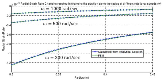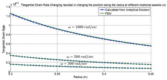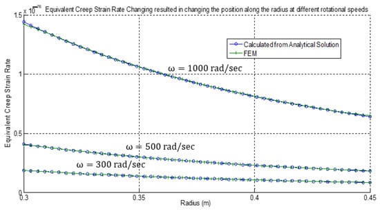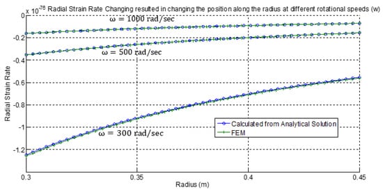 Finally, Figure 9, Figure 10 and Figure 11 show the radial strain rate, tangential strain rate, and equivalent creep strain obtained from both analytical and numerical solutions for the three rotational speeds 300, 500, and 1000 rad/sec, respectively. Again, all results shown are in full agreement with similar published data and display excellent compliance and high accuracy between analytical and numerical solutions [26,27,28,29,40,41,42,43].