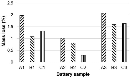 According to the graph in Figure 1, it can be seen that the batteries immersed in the alkaline medium suffered the greatest mass losses: A3 (2.08%), B3 (1.59%), C3 (1.64%), followed by the acid solution and rainwater. The lowest mass losses were observed for batteries immersed in a pH 5.63 solution (rainwater). Here, the lowest loss was for battery C (0.29%).