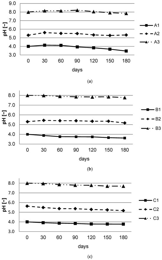 During the 180 days, a small variation can be observed in the pH of the immersion solution. In the case of battery A, there is an increase in the first 30 days, followed by a decrease (Figure 2a). At batteries B and C, a decrease in pH could be observed since the beginning of the experiment. This decrease continues until the end of the test period. These pH variations can be observed in all cases, regardless of the type of battery or the solution in which it was immersed.