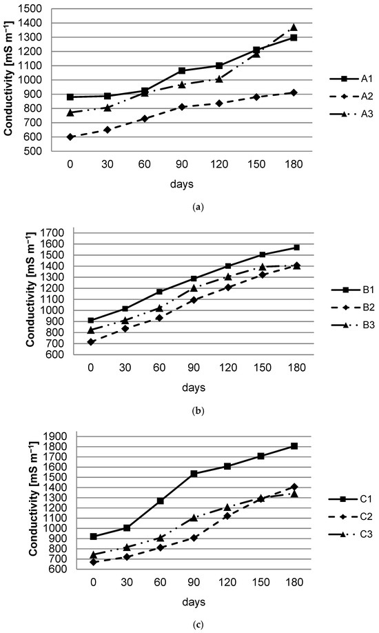 The highest increase of conductivity was recorded for battery C1 (from 920 mS m−1 to 1806 mS m−1), followed by battery B1 (from 910 mS m−1 to 1568 mS m−1). The lowest conductivity values were in the case of the A2 battery (from 600 mS m−1 to 911 mS m−1), followed by the C2 battery (from 669 mS m−1 to 1407 mS m−1).