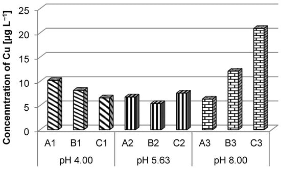 Analyzing the concentration of copper depending on the type of battery and the pH of the solution, it can be observed that the higher the pH of the solution, the lower the concentration of copper, so that at pH = 8.00, the concentration of copper was 6.33 µg L−1, and in the case of battery C, the concentration of Cu decreased with increasing pH.