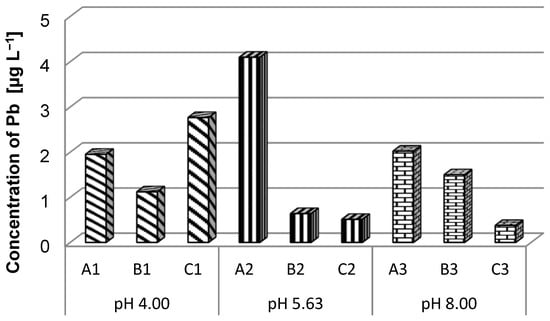 As seen in Figure 5, battery A recorded high Pb concentrations regardless of the pH value of the solution. The highest concentration was observed in the case of sample A2 (4.09 µg L−1). The concentration of Pb in the solutions in which the type C batteries were immersed decreased with the increase in pH. For batteries A and B, it was not possible to establish whether the pH influences the amount of Pb that was transferred into the solution because there were variations depending on the pH of the immersion solution.