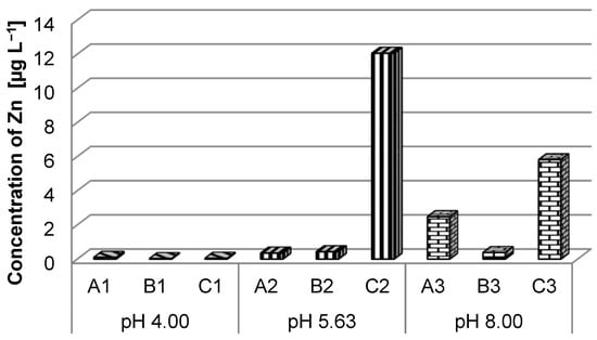 At pH = 4.00, the concentration of zinc in the solution was insignificant (Figure 6), regardless of the type of battery used in the experiment, but it increased with the pH value, highlighting that battery C has the highest concentrations at pH = 5.63 and pH = 8.00, respectively. A higher concentration is also noticeable in the case of battery A at pH = 8.00 (sample A3 = 2.48 µg L−1) compared to the values obtained at low pH (4.00 and 5.63, respectively). It can be concluded that a higher pH value influences the Zn concentration transferred into the immersion solution.