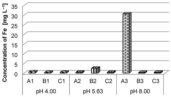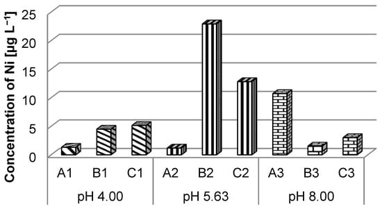 The highest concentrations of nickel (B2: 22.93 µg L−1 and C2: 12.83 µg L−1) were recorded in the solution with pH = 5.63 (batteries B and C), the exception being battery A (Figure 7), which has higher concentrations elevated at pH = 8.00 (A3: 10.73 µg L−1). Following these results, it can be concluded that at pH = 5.63, the transfer of nickel from the battery to the solution takes place.