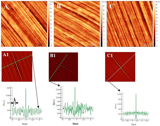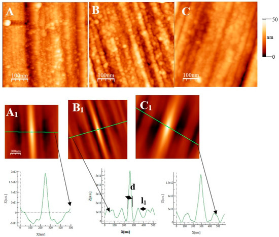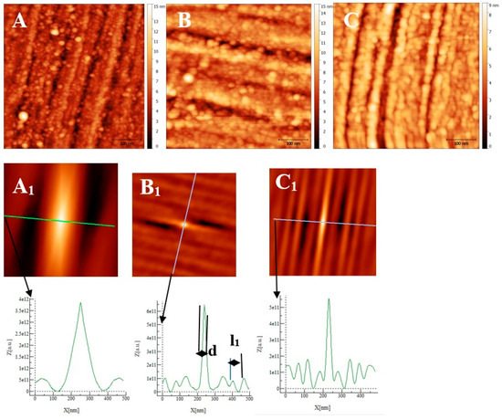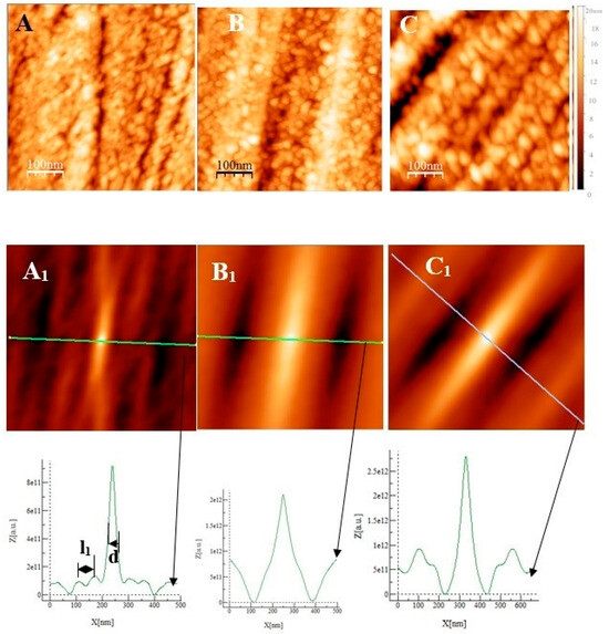 Atomic Force Microscopy image (2 µm × 2 µm) of the substrate after polishing: (A) AISI 304. (B) AISI 316. (C) Inconel 600. (A1), (B1), and (C1) are self-correlation images calculated using, respectively, images (A), (B) and (C) as input with typical cross-sections allowing to determine the average distance named l between two trenches resulting from the polishing steps.