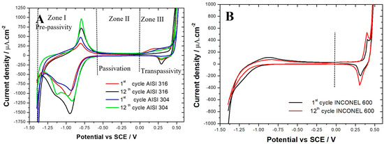 Cyclic voltammograms (1st and 12th cycles) obtained in 0.1 M NaOH solution. Potential range: −1.4 to 0.5 V vs. SCE. Scanning rate: dE/dt = 25 mV/s. (A) AISI 316 and AISI 304 samples. (B) Inconel 600.