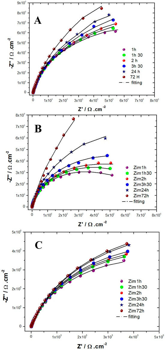 The evolution of the Nyquist diagrams as a function of the immersion time in the solution simulating reinforced concrete for the three alloys is shown in Figure 4. For the three alloys, the capacitive loop has a diameter that increases with the exposure time, meaning that the resistance of the passive films increases with the immersion time, which is in agreement with the literature [9,26,44]. All authors [9,26,44] suggest that the steady state of the steels exposed to alkaline media is well established after 3 days of immersion. Therefore, we chose to collect EIS data only during this time-lapse [9,26]. For both AISI 304 and AISI 316, the impedance measurements were performed to show that the capacitive loop has a linear behavior at low-frequency ranges after 72 h of immersion. Suggesting that the film formed is stable and protective. This tendency is less clear for Inconel 600, meaning that the amplitude of the capacitive loops is less than that for the AISI 304 and AISI 316 stainless steel. This result indicates that the films formed on Inconel 600 are less effective than those formed on stainless steel.
