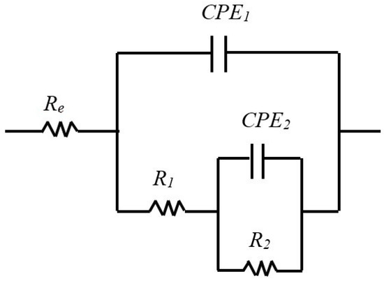 In our case, the literature [1,26] suggests that the first time constant is associated with the charge transfer process where R1 is the charge transfer resistance, and CPE1 is the capacitance of the double layer at high frequencies. At low frequencies, the second time constant is associated with the oxidation–reduction process, which takes place in the passive film. C2 is associated with the capacitive behavior of the film, and R2 is linked to the resistance of the oxidation–reduction process [1,26].