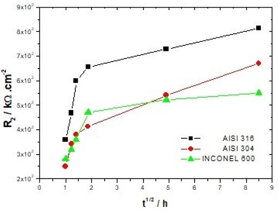 It can be seen in Figure 6 that the resistance R2 attributed to the film increases continuously up to 72 h of immersion for both types of stainless steel. The Inconel 600 displays a strong increase in R2 during the first hours of immersion, and beyond 3 h 30, this increase becomes smoother. Therefore, it appears that the formation of a stable passive film is faster on Inconel 600 than on stainless steel. This may be due to the fact that the films formed on the nickel-based alloys are thinner than those formed on the stainless steel [37,48]. However, the values of R2 (Table 3, Table 4 and Table 5) and the Nyquist figures indicate that the films formed on Inconel 600 in alkaline environments and at ambient temperatures do not appear to be more protective than those formed on stainless steel. On the contrary, it seems that the films formed on AISI 316 are more protective in this alkaline environment.