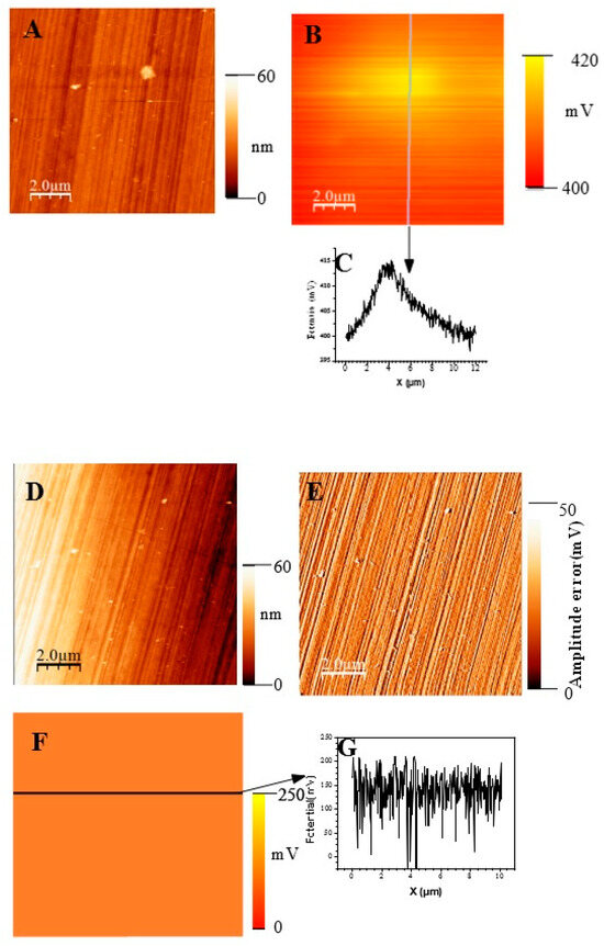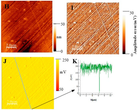 (Large scale (10 µm × 10 µm) topographic AFM and corresponding SKPFM images for three different immersion times measured for the AISI316 sample. t = 30 min (A) Surface topography; (B) potential image (SKPFM) associated to image (A); (C) cross-section along the line showed on image (B) showing the potential variation across the potential image t = 1 h 30; (D) surface topography; (E) AFM error image associated to image (D); (F) potential image (SKPFM) associated to image (D); (G) Cross-section along the line showed on image (F) showing the potential variation across a mean value for the potential image. T = 72 h (H) surface topography; (I) AFM error image associated with image (H); (J) potential image (SKPFM) associated with image (H); (K) Cross-section along the line showed in image (J) showing the potential variation across a mean value for the potential image.