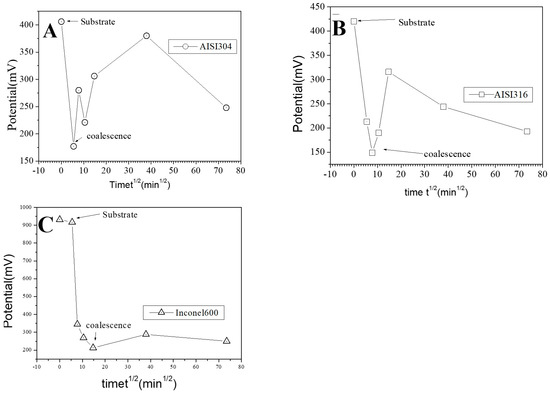 Evolution of the mean surface potential as a function of the square of immersion time (t½) for the AISI304 (A), AISI316 (B), and Inconel 600 (C) samples.