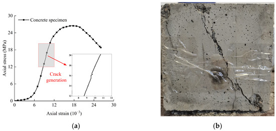 The uniaxial compression test was carried out on the cured rock-like specimens to obtain the mechanical parameters of the rock-like specimens and the fissure specimens required for grouting [12]. The stress–strain curves and damage patterns of the rock-like specimens under uniaxial compression are shown in Figure 1. From Figure 1, it can be observed that when the load reaches 60% of the peak load, the specimen produces cracks, and under continuous loading, the cracks continue to expand and develop, eventually forming the main cracks.