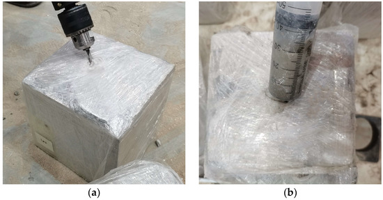 Grouting process of fissure specimen. (a) Drilling the grouting hole; (b) Grouting with a syringe.